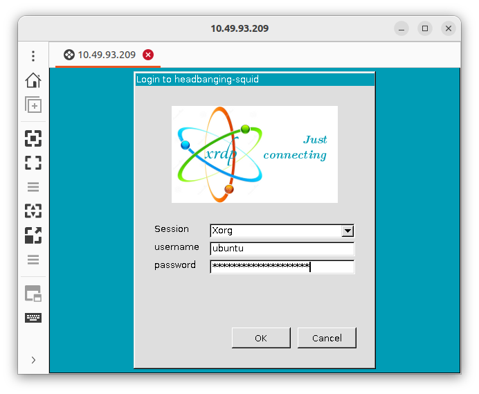On Windows, we can connect to the RDP server with the “Remote Desktop Connection” application. There, we enter the virtual machine’s IP address, set the session to XOrg and enter the username and password we created on the previous step.