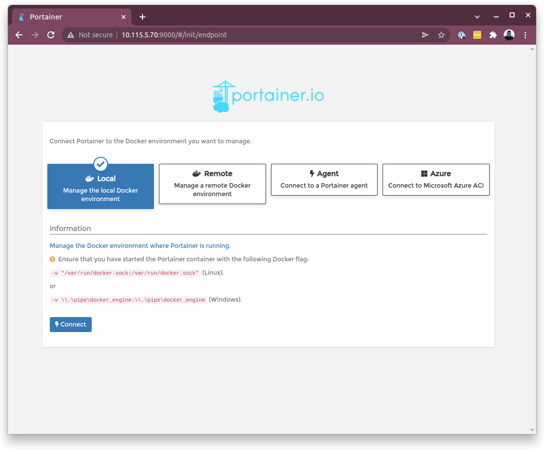 In a web browser, enter the Portainer IP address from the previous step followed by the Portainer port, 9000, like this: “:9000”. Set up a username and password at the prompt, then select the option for managing a local Docker environment and click connect.