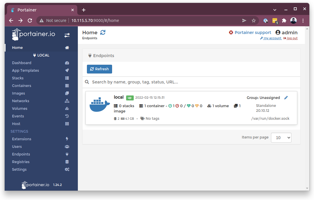 Click on the newly created “Local” environment to manage the Docker instance on your local VM.